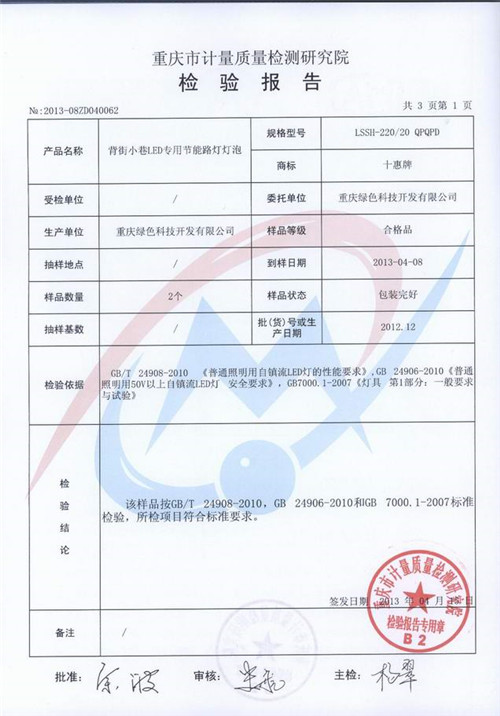 Our independent research and development, manufacturing of the "ten Hui card" Beijiexiaoxiang integration easy special LED energy saving lamp bulb "(color temperature: 4500K, power: 20W), recently, by the Chongqing Academy of Metrology and quality inspection in accordance with GB/T, 24908-2010, 24906-2010 and GB were detected by GB, 7000.1-2007 Standard Test results: (1) high light efficiency: lamp luminous flux is 1725lm, light efficiency is 87.1lm/W; (2) good quality: road vertical facade lighting illumination 9.6lx Road, vertical plane illumination is more than 15lx; (3) good protective performance: waterproof and dustproof grade IP65; (4) power factor: 0.85; (5) good heat dissipation performance light weight: wind tunnel, fin fin radiator, thermal conductivity is 226{W/ (M. C)}, the whole light weight is less than 400g; (6) good color: color index 71; (7) a small decline: This product at 75 degrees of temperature in the oven Continuous light (equivalent to 3 months under normal conditions for 2 years) decay is only 6%. All the items inspected are in conformity with the national standards and obtained the certificate of inspection report issued by Chongqing Institute of measurement and quality inspection.