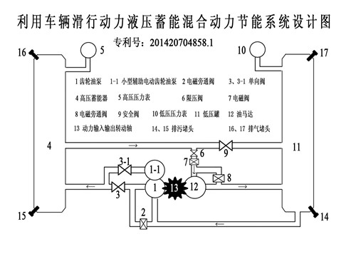 Install a throttle position switch in the vehicle electronic throttle pedal, when the driver's right foot to depress the accelerator pedal vehicle refueling, electromagnetic by-pass valve 2 is opened, the energy storage system is not working condition; when the driver foot from the accelerator when releasing the vehicle into the sliding state, when the electromagnetic bypass valve 2 is closed, the vehicle power system the taxi started working storage. When the vehicle needs afterburner, the driver right foot on the accelerator when the electromagnetic bypass valve 2 is opened, the energy storage system (gear pump) is not working condition, and an electromagnetic valve 7 is opened to release the 12 motor oil storage pressure within the system, the oil motor 12 began to work, instead of a motor vehicle walk; when the pressure of energy release to the rated pressure, the pressure limiting valve 6 closed, low pressure rated output, the vehicle engine started to work. When the oil motor 12 does not work, the electromagnetic bypass valve 8 is in normally open state, and the solenoid valve 7 is in a closed state. When the gear oil pump 1 works, the electromagnetic bypass valve 8 is in the open state; when the driver's right foot leaves the accelerator pedal and the vehicle slides, the electromagnetic bypass valve 8 is in a closed state.