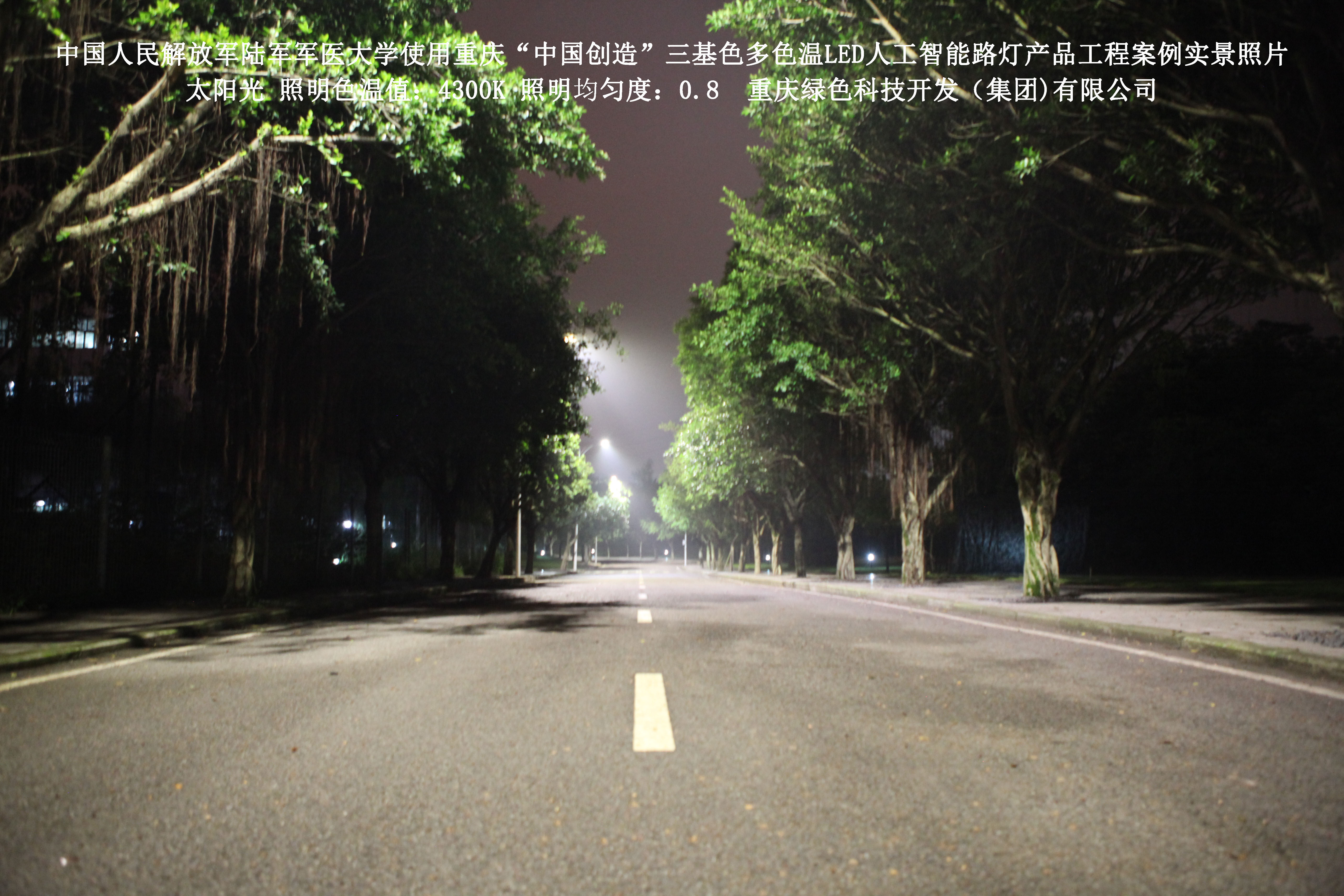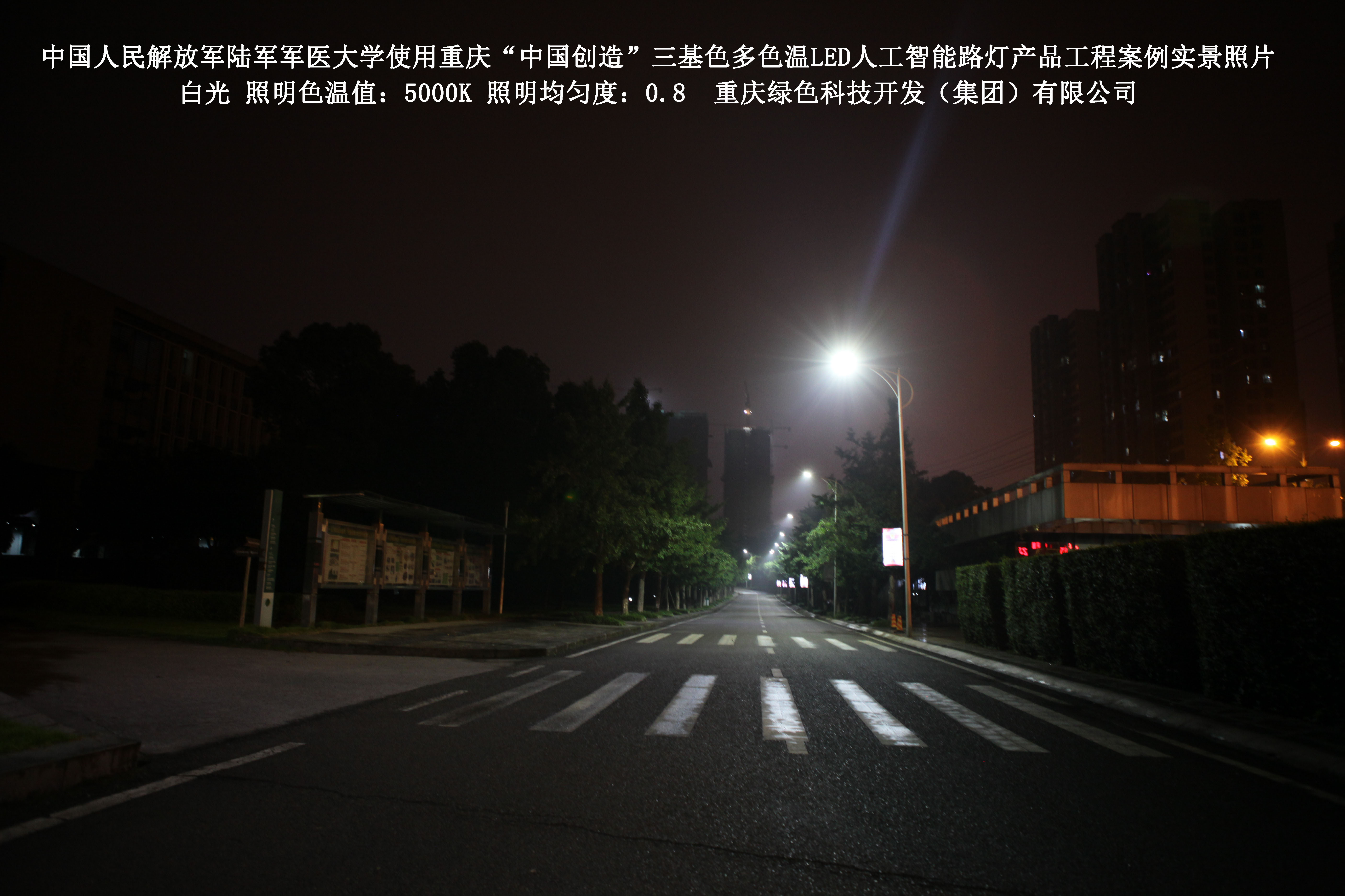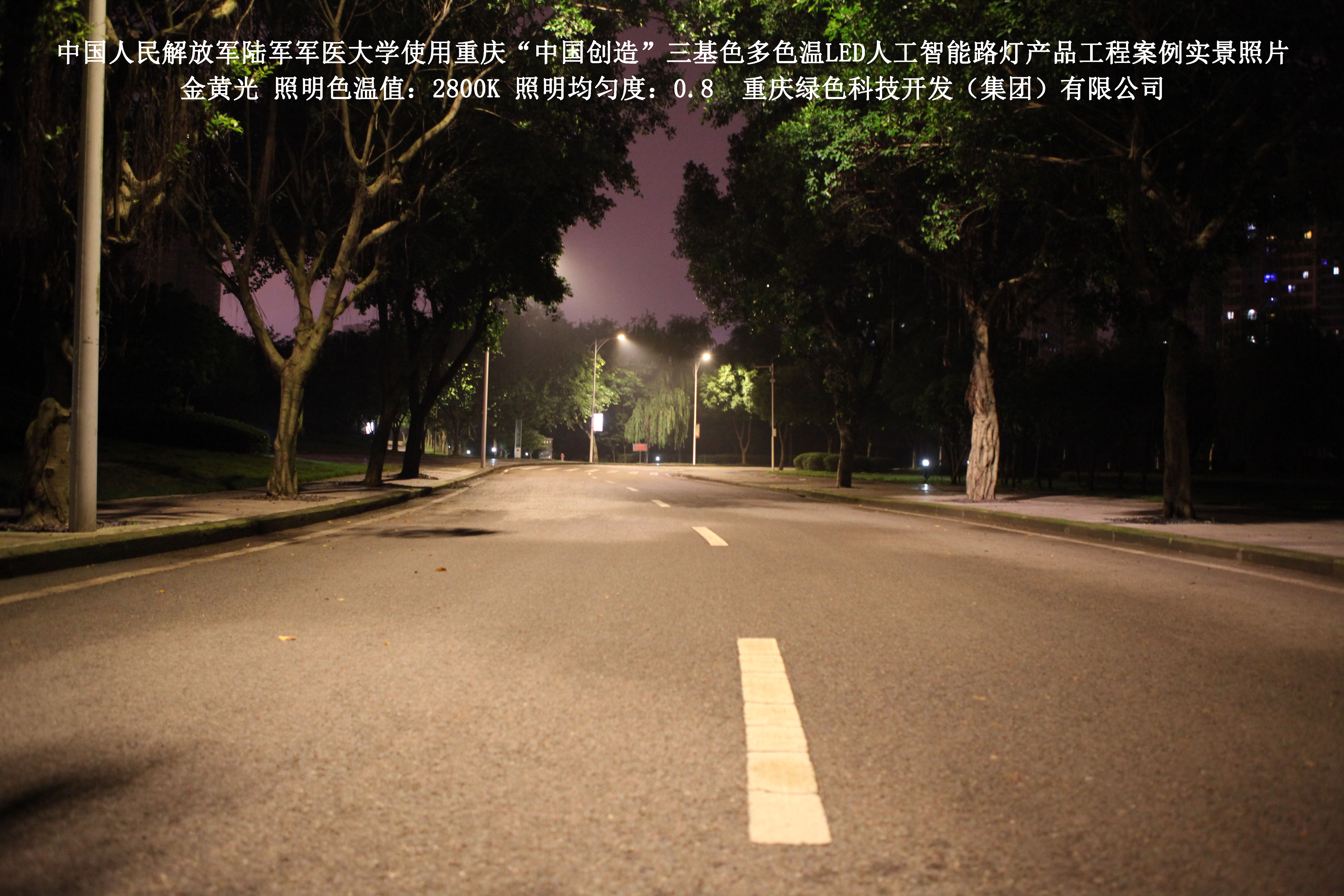 2018年4月,中國人民解放軍陸軍軍醫大學使用了我司研發制造的重慶“中國創造”三基色多色溫LED人工智能路燈,對沙坪壩大學城校區道路實施了綠色照明科技節能改造工程,該工程已全面竣工。工程實施后,極大地提高了照明清晰度、燈光均勻度、舒適度,實現城市路燈照明系統的智能化管理。