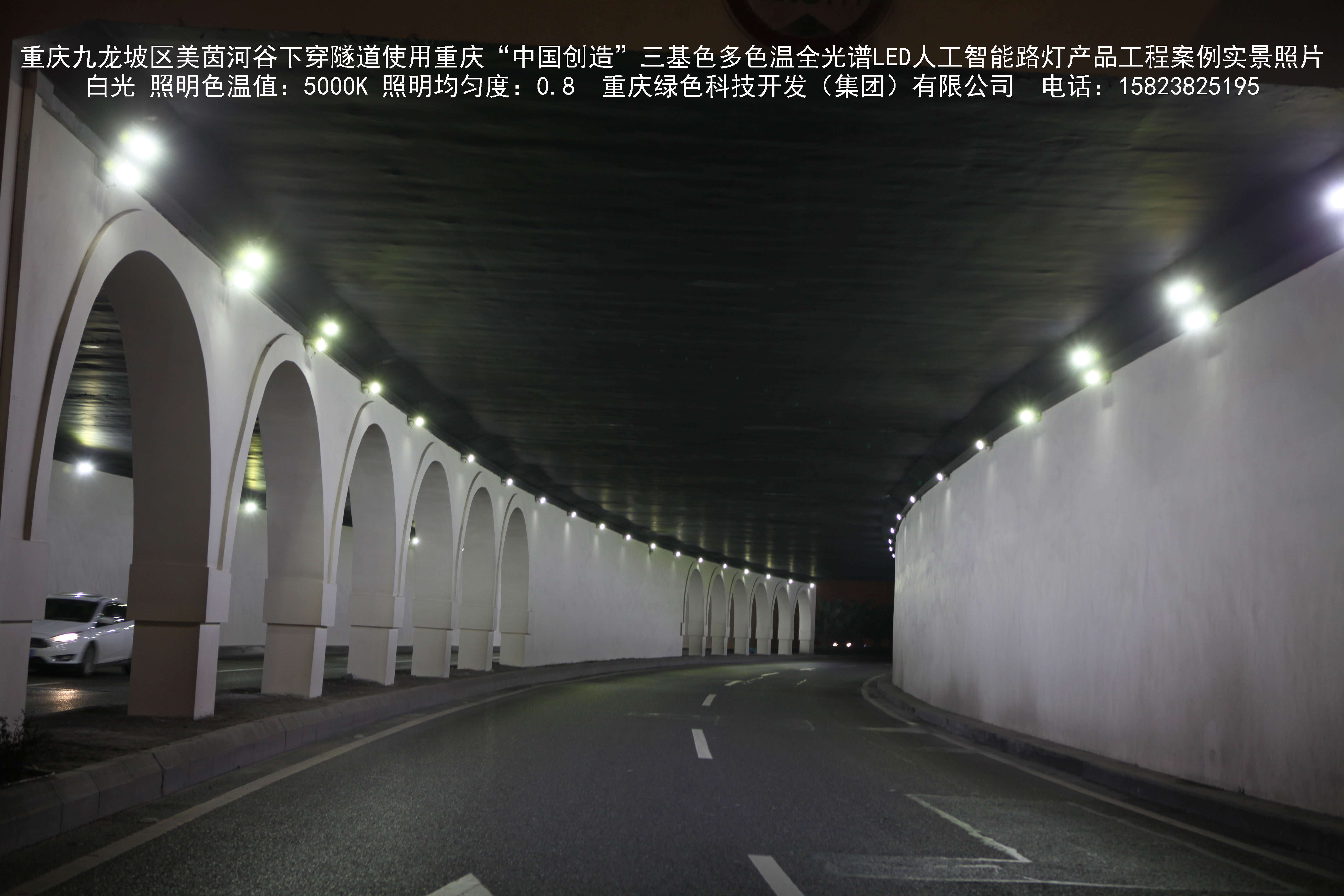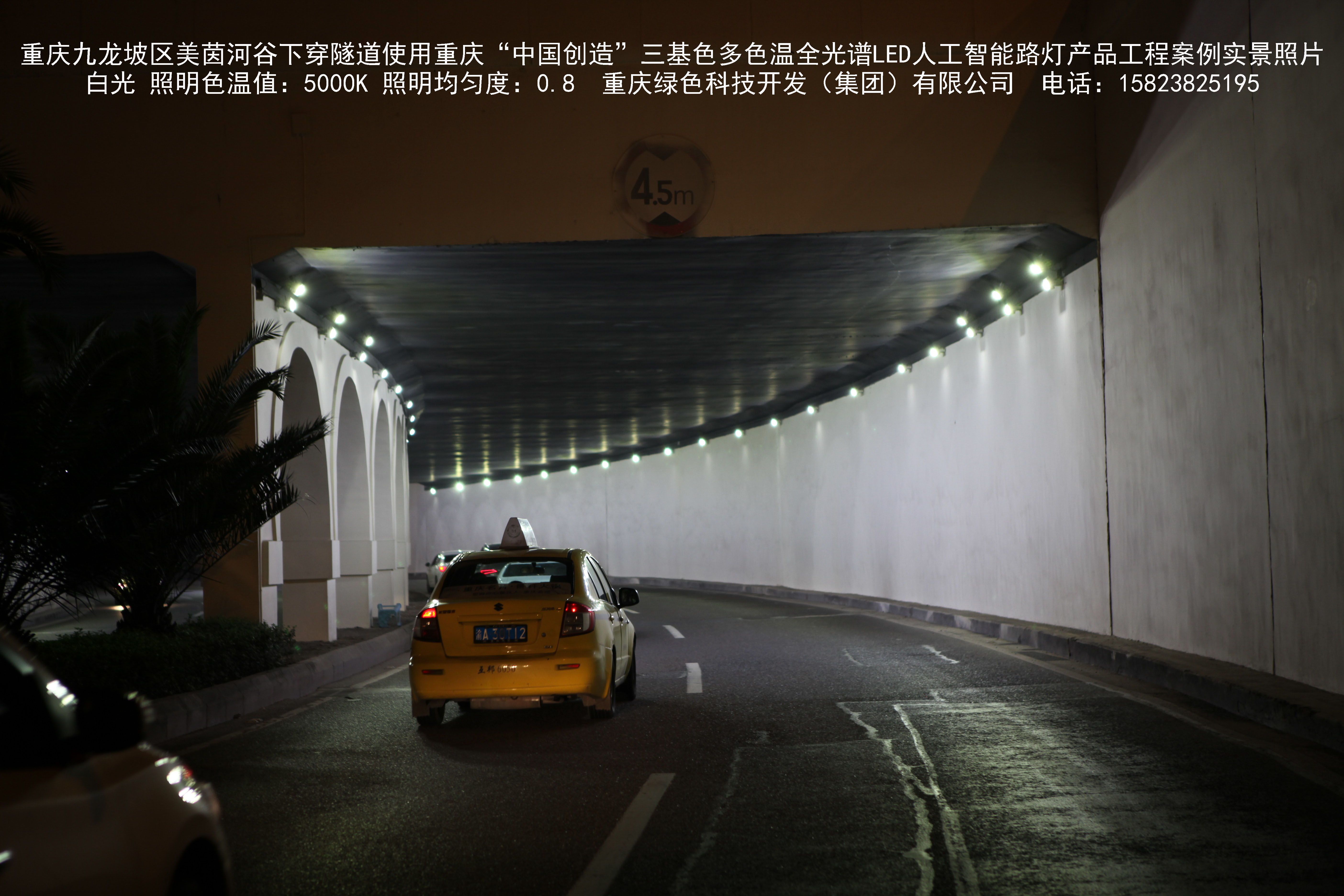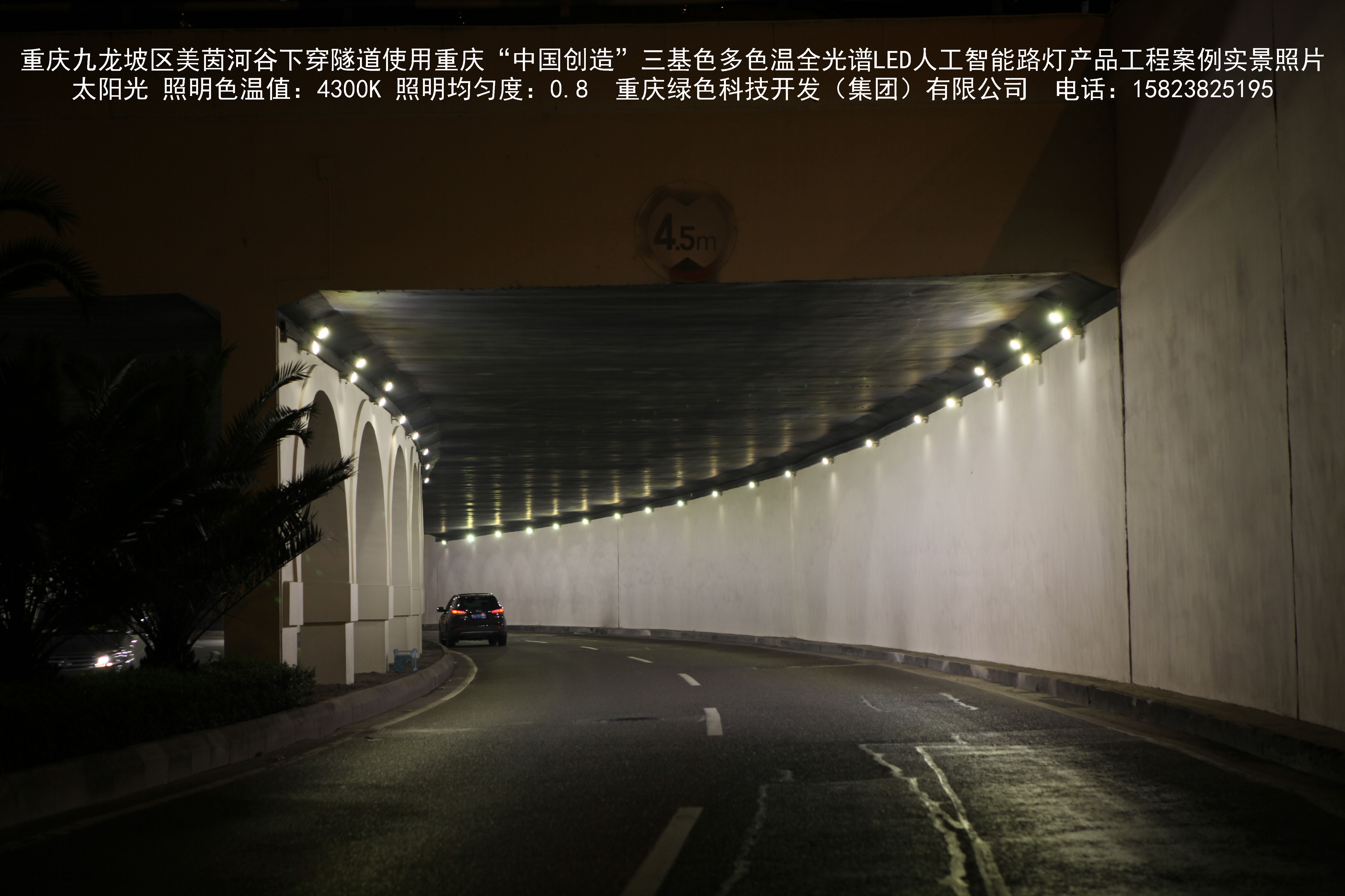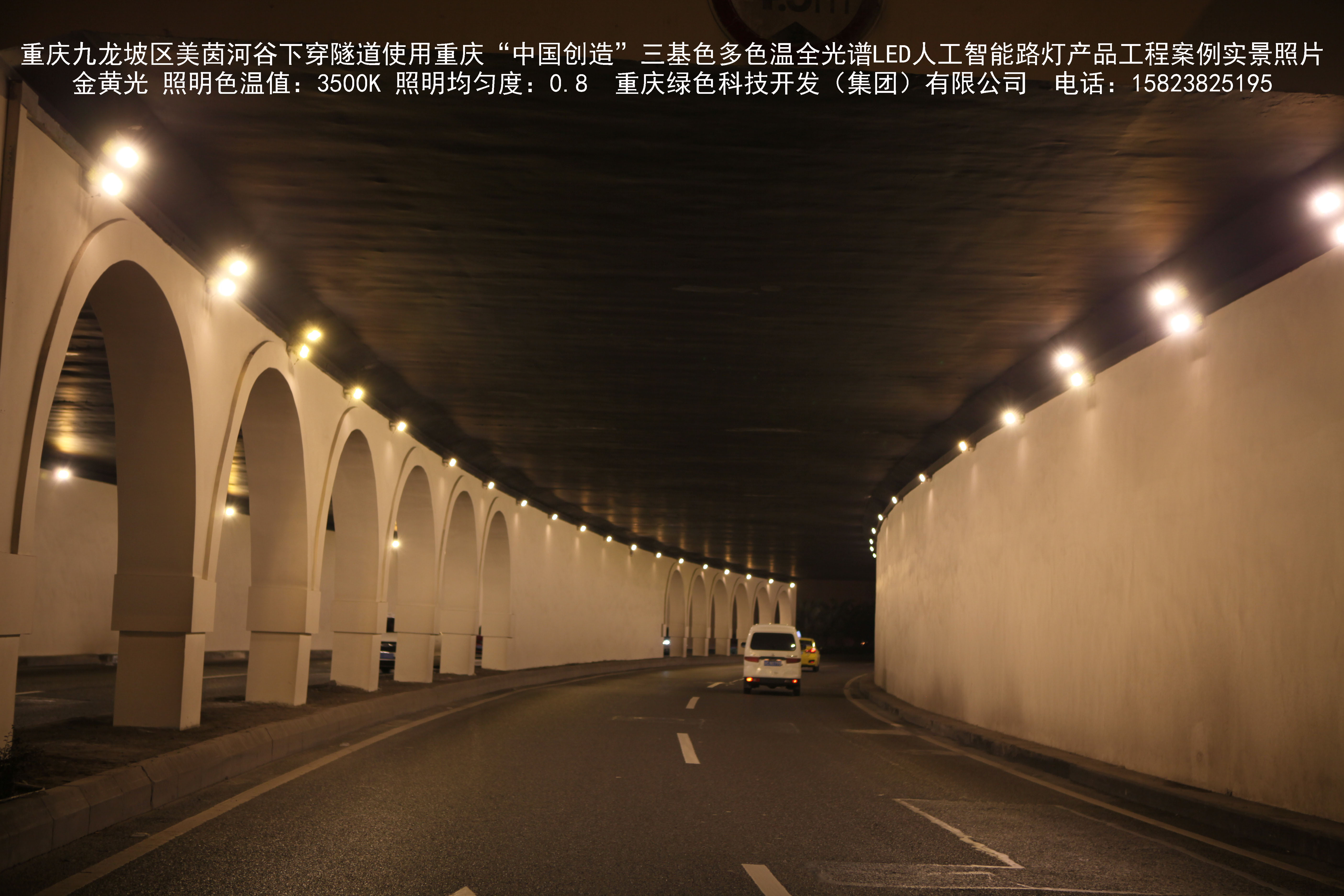 2018年9月,重慶市九龍坡區城市管理局使用我司自主研發制造的重慶“中國創造”三基色多色溫全光譜LED人工智能隧道燈系列產品,實施了美茵河谷下穿隧道市政設施品質提升工程。該工程已全面竣工。工程實施后,極大地提高了城市照明清晰度、燈光均勻度、舒適度。通過智能終端實現單燈感知、線纜防盜報警,與原高壓鈉燈相比,節能率60%以上,有效解決了關閉控制回路或間隔關燈方式造成的照明暗區,確保行人和車輛通行的安全,實現城市路燈照明系統的智能化管理,推進了智慧城市建設。