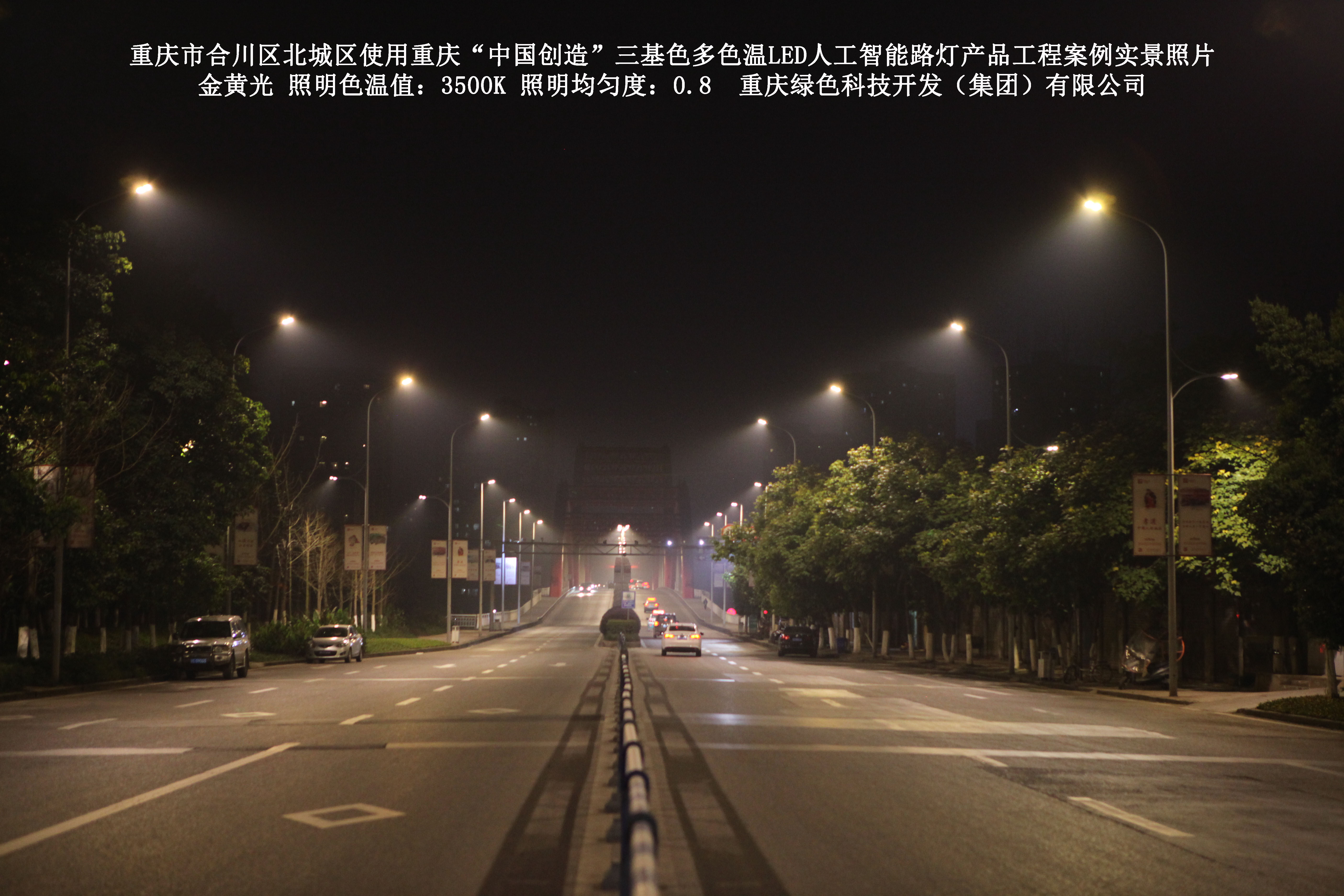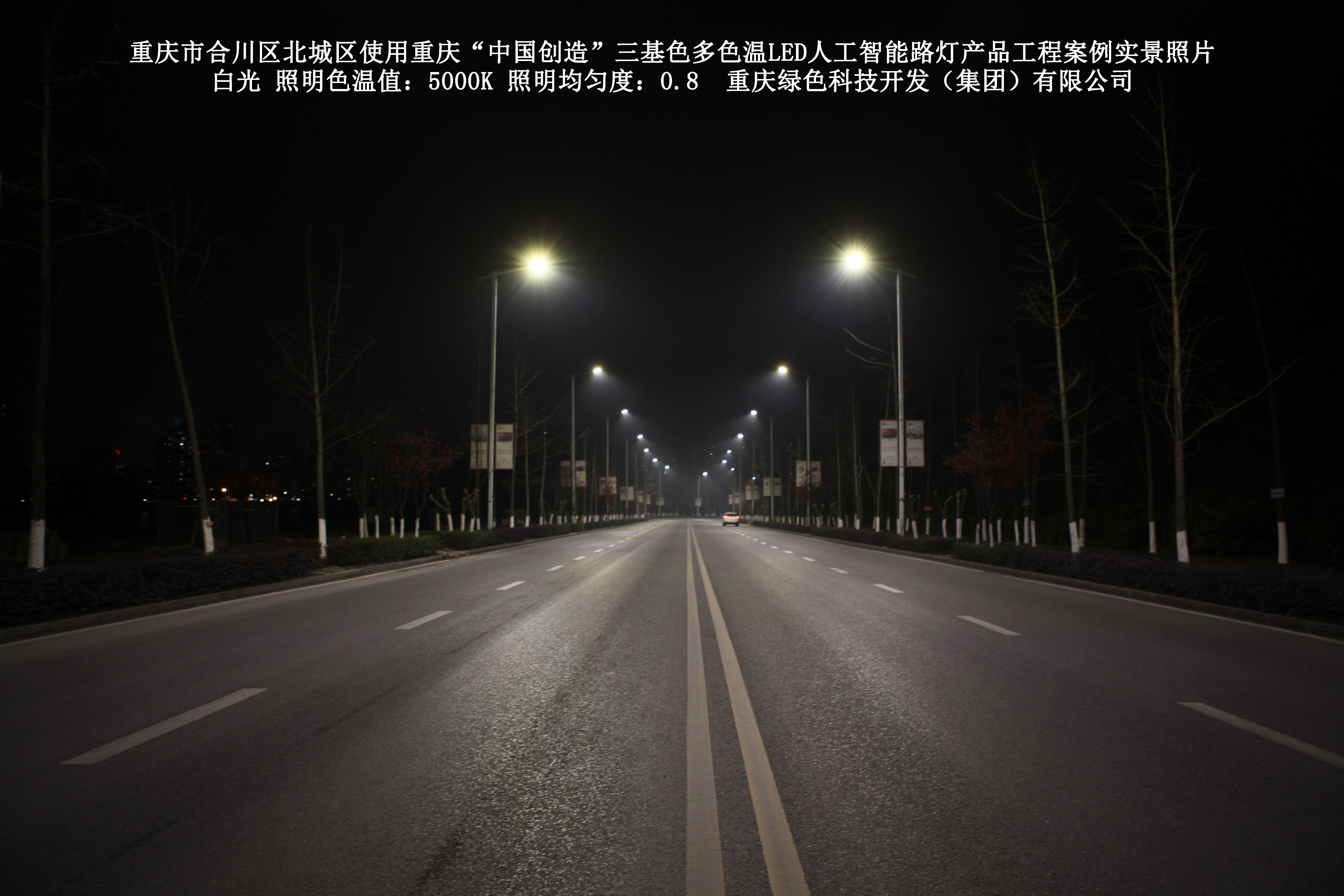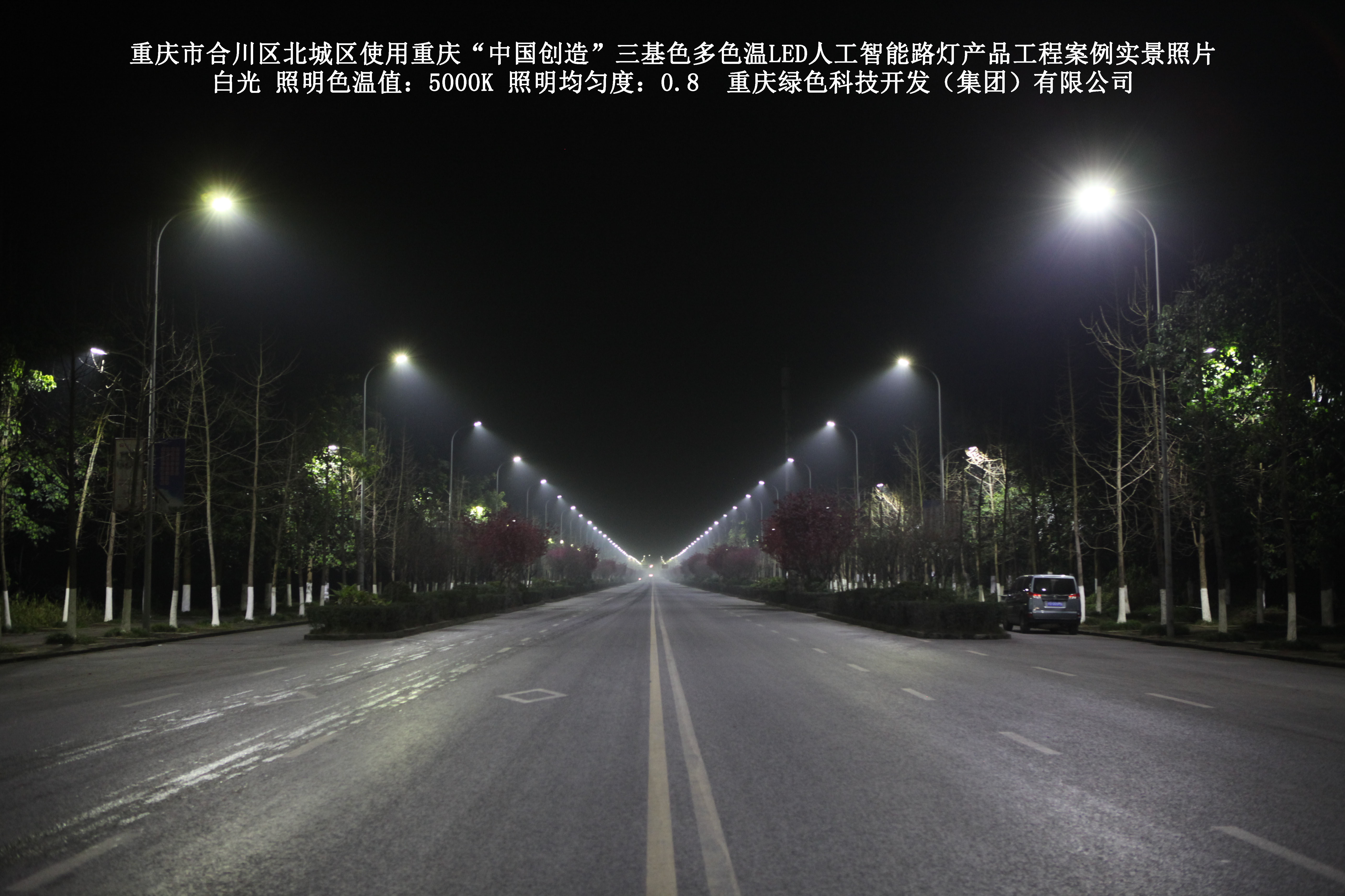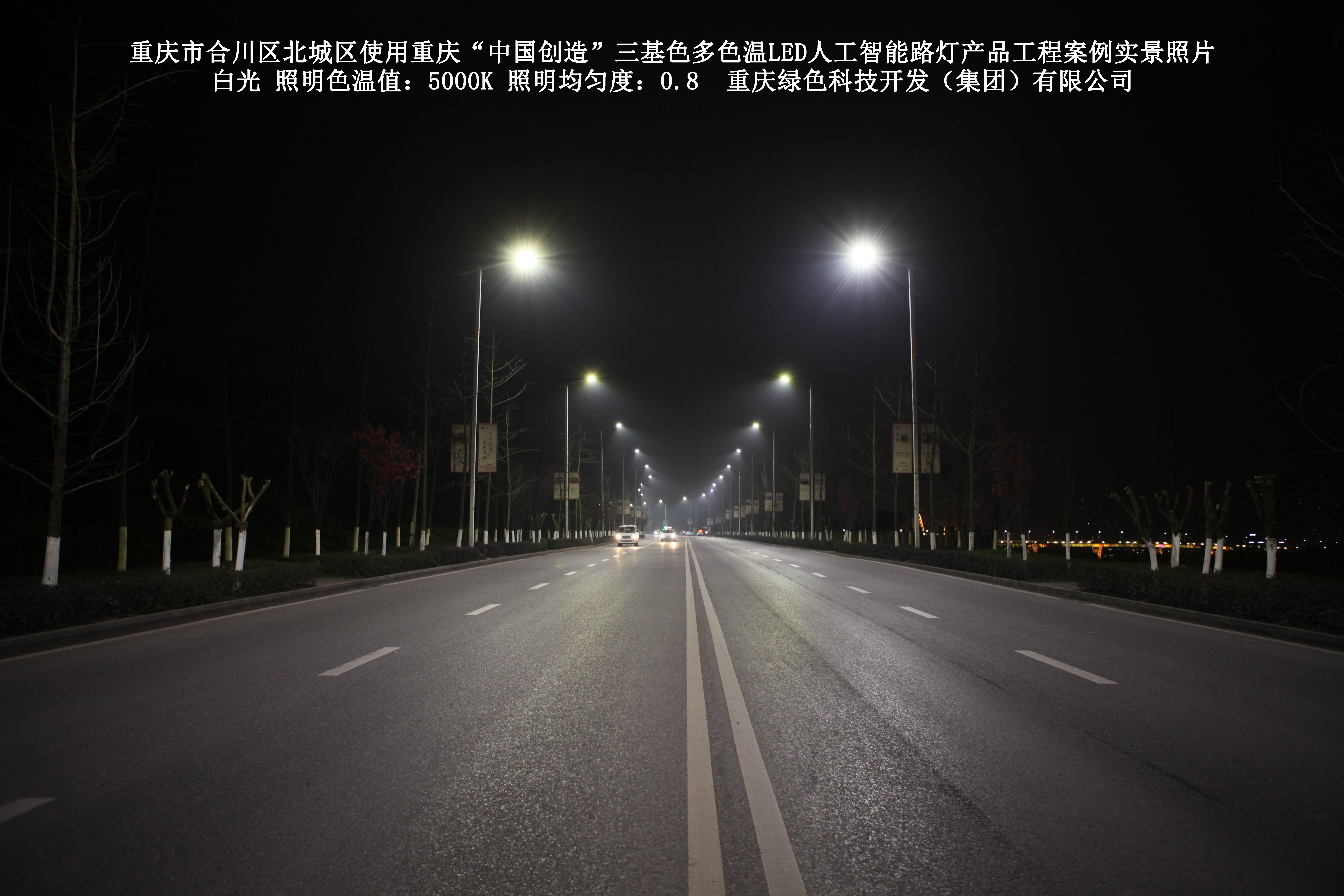 2019年1月,重慶市合川區城市管理局使用了我司研發制造的重慶“中國創造”三基色多色溫LED人工智能路燈5144盞,對合川區北城區實施了綠色照明科技節能改造工程,該工程已全面竣工。工程實施后,極大地提高了合川區北城區城市照明清晰度、燈光均勻度、舒適度。通過智能終端實現單燈感知、線纜防盜報警,與原高壓鈉燈相比,節能率60%以上,有效解決了關閉控制回路或間隔關燈方式造成的照明暗區,確保行人和車輛通行的安全,實現城市路燈照明系統的智能化管理,推進了智慧城市建設。