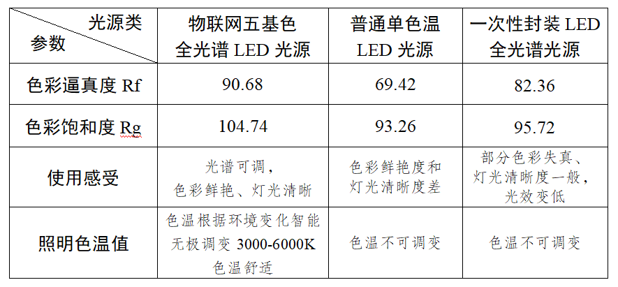 圖2 物聯網五基色全光譜多色溫LED光源與普通單色溫LED光源、一次性封裝LED全光譜光源參數對比